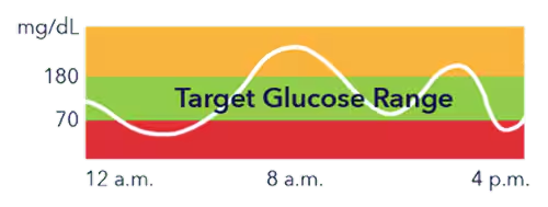 It is recommended to maintain a blood glucose, or glycemic, range of 70mg/dL (low) -180 mg/dL (high) at least 70% of time.1,3