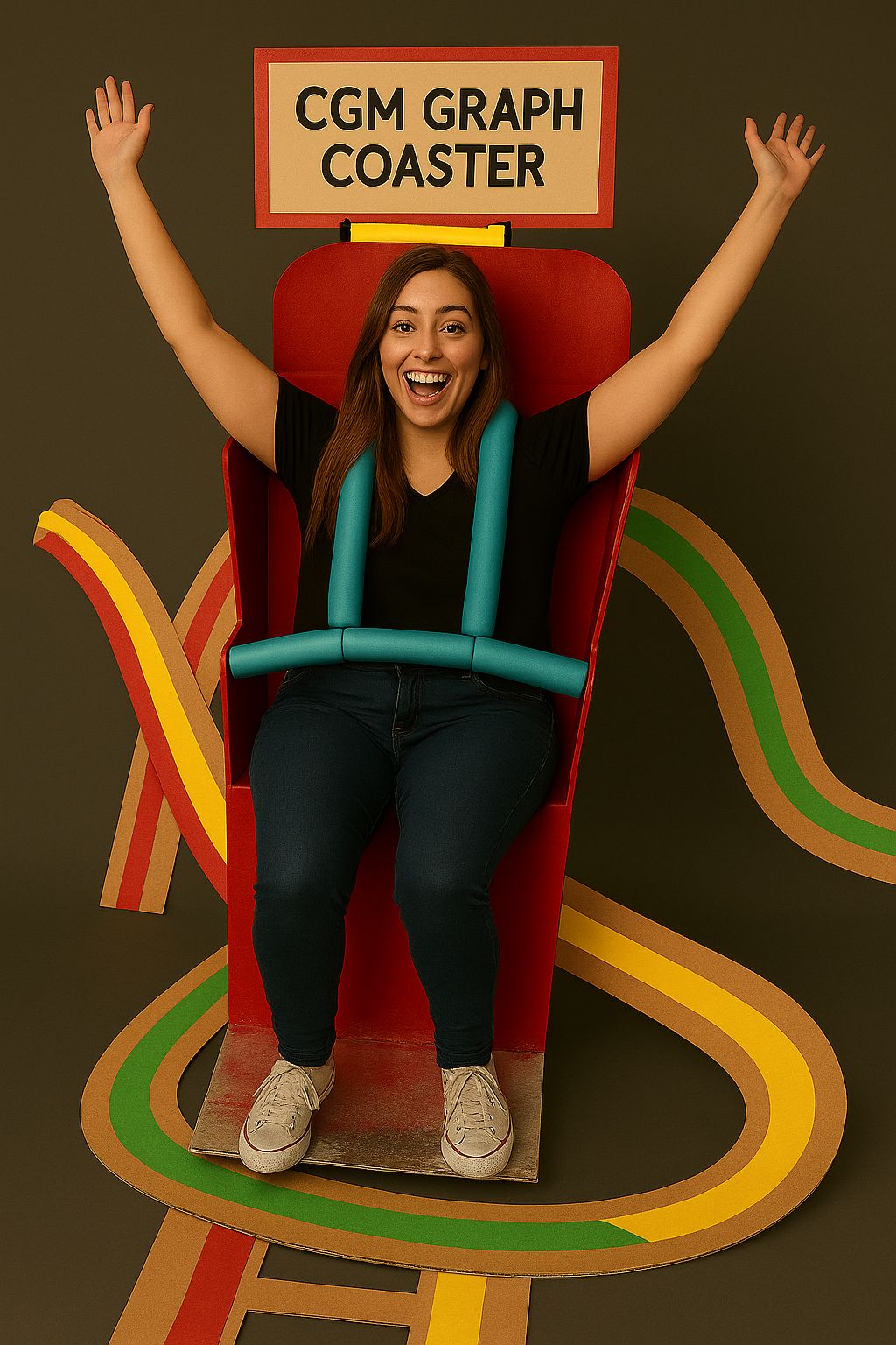 To create the illusion that you’re sitting in the coaster seat, stuff the extra pair of pants with crumpled newspaper and attach to the coaster seat. Lastly, cut a hole in the seat for your real body to go through. And just like that, you’re riding the roller coaster of a CGM graph!