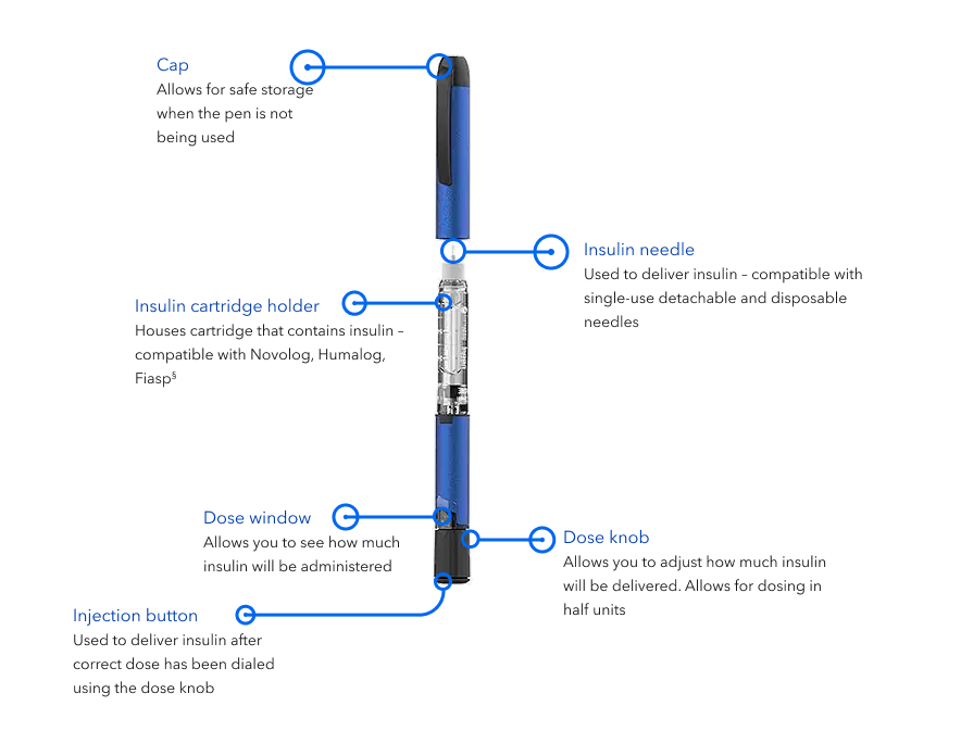 Cartridges are not included with InPen. You’ll need a separate prescription for cartridges. Cartridges can be ordered from the same pharmacy where you get your other diabetes supplies. InPen is compatible with Humalog, Novolog and Fiasp U-100 3.0 mL insulin cartridges.